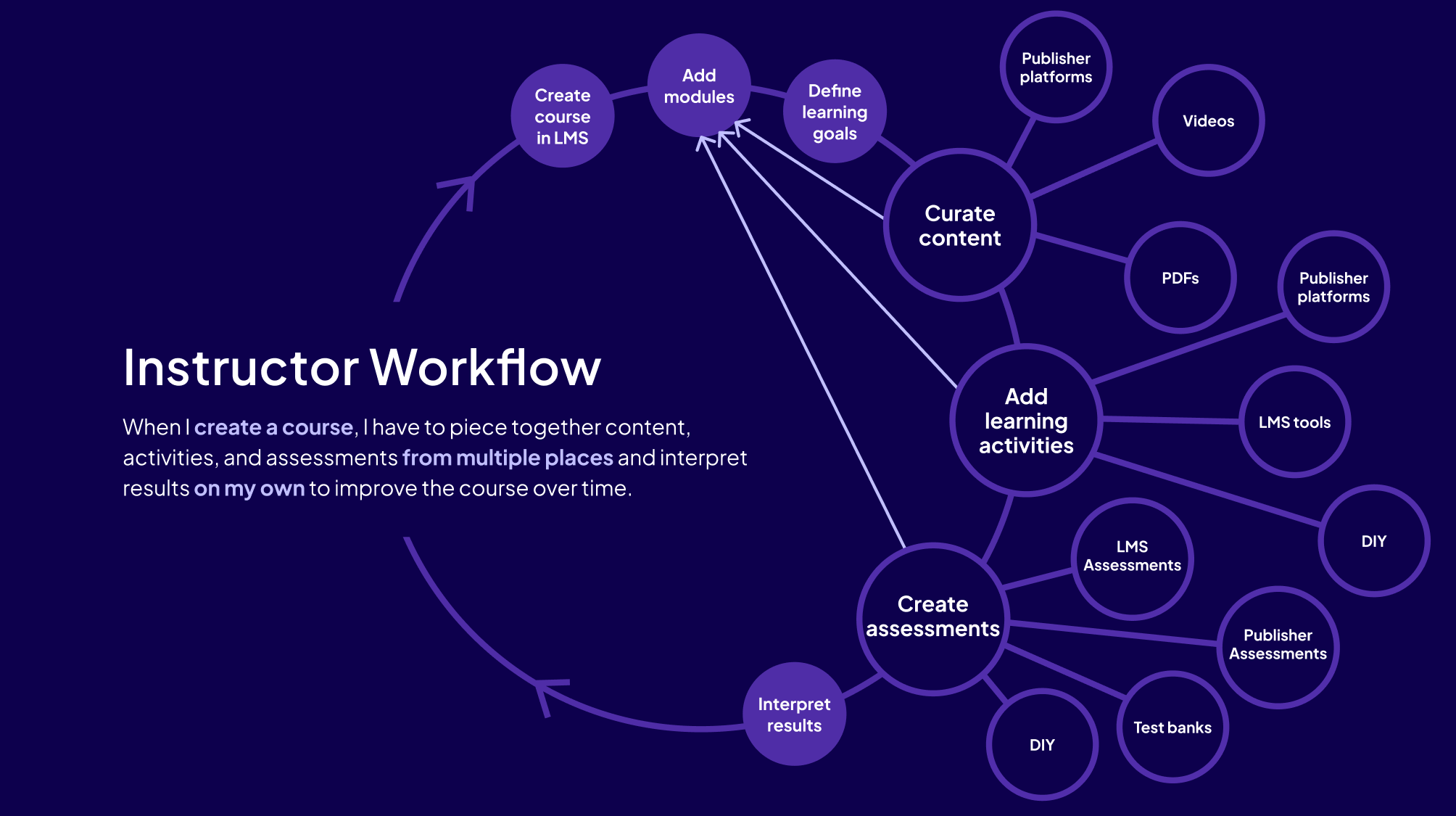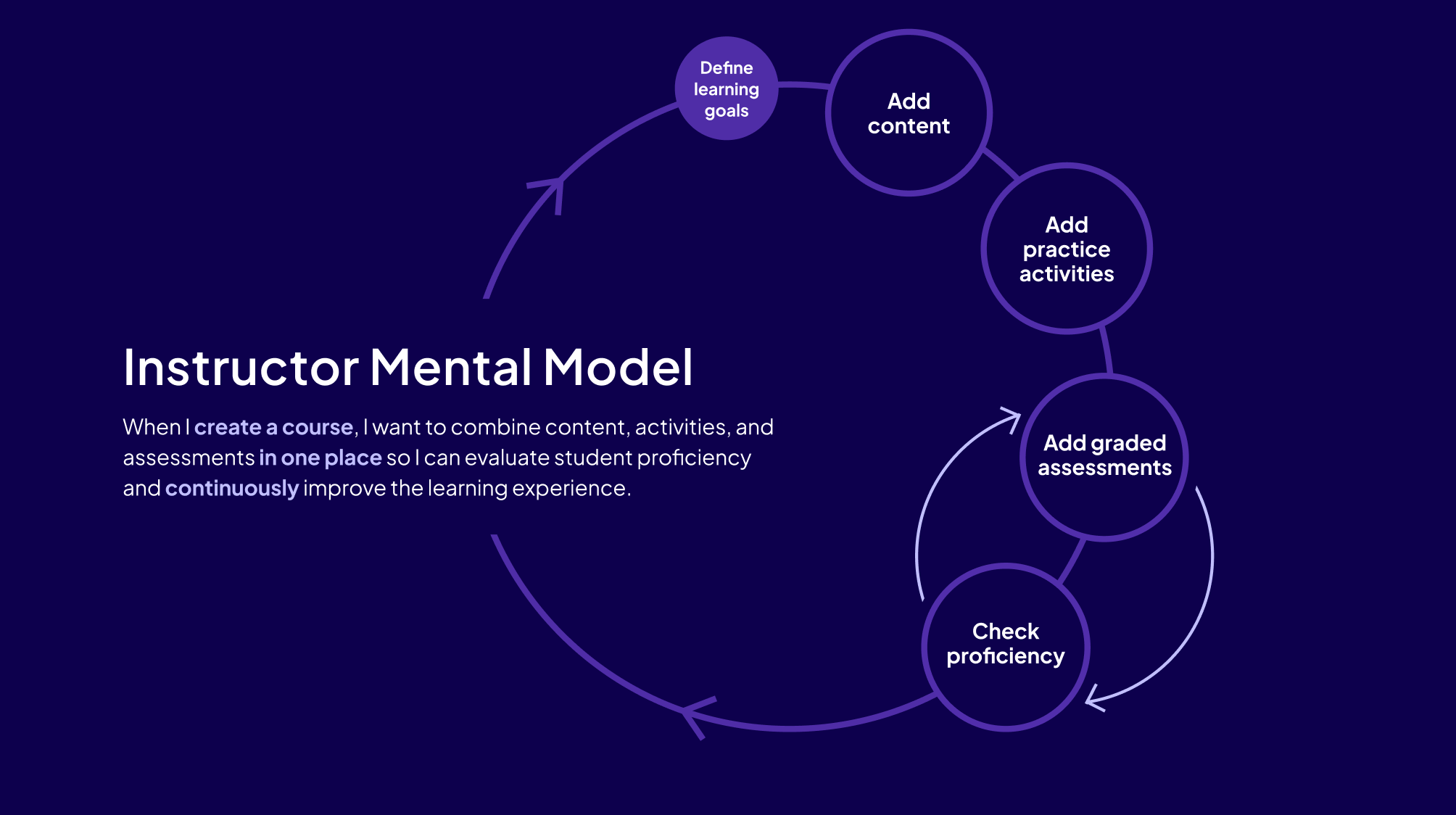 The foundation for the vision was the instructor mental model for teaching a course – create the course, curate content, check understanding, and improve the course ahead of the next semester. I mapped the current instructor workflow against this model to identify gaps and pain points.